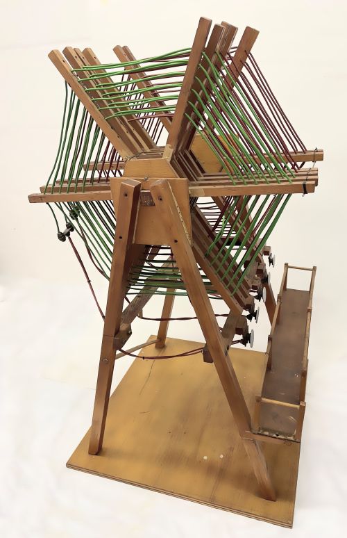 This model is a replica of the Aerial Tuning Inductor from the C Building at Rugby Radio Station. The original inductor consisted of a framework of copper and wood, forming five coils, each with eight turns of cable. Its web-like appearance led to it being commonly known as the “spider.”